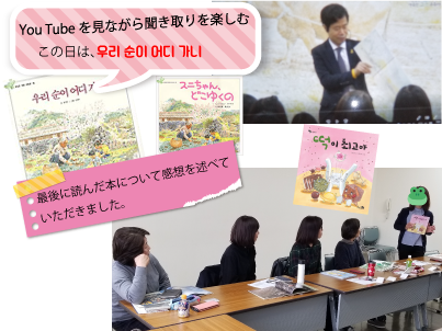 前半一時間で『우리 순이 어디가니』を読みました。韓国のお母さん方が子供に読み聞かせる本の中でポピュラーな絵本です。後半は好きな本を読んでもらいました。
