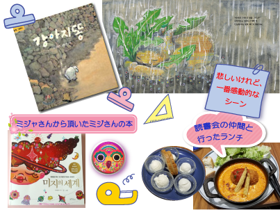 後半の自由読書時間には、大邱の수성못を扱った絵本『수성못』が話題になり、12月渡韓予定のNさんが時間があれば訪れていみたいと言っていたくらい気に入っていただけました。この本は、教保文庫では注文できずチェッコリでのみ購入できます。