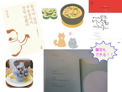 後半は、自分の読んだ本の中でおススメの本を紹介していただくコーナー。『음식이 있어 서울살이가 견딜 만했다』を紹介してくださったゆうこさん。料理名の謂れとその料理が沢山ある通りまで説明してくださっている本とあって、思わず買いたくなりました。ドラマ도께비にでたことで有名になった『어쩌면 들이 너의 슬픔을 가져갈지도 몰라』をゆきこさんはもってきてくださいました。황진이、이해인 수녀님、감소월等有名な詩人の詩が載っていて隣のページには今流行りの筆写ができるというのも良いですね。今日は写真を撮るのを忘れてしまいとても残念でした。恒例のランチは、干支のネズミに因んだかき氷を期間限定でだしている『カフェクノップゥ』でいただきました。
